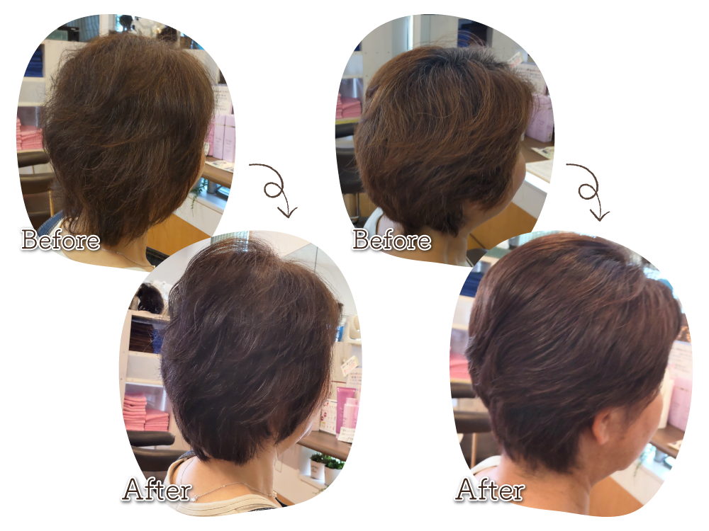 年齢と共に、パサついてまとまりにくくなって悩んでいたところ、修復カラー潤艶コースで染めるようになったら、艶々で手触りもよくなり、とても嬉しいです。